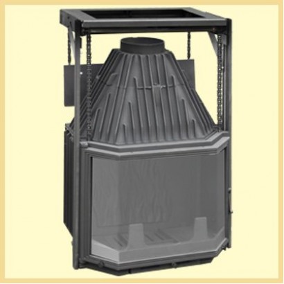 Топка снабжена большим призматическим термостойким стеклом и легким и бесшумным подъемным механизмом, с уравновешивающими противовесами и тросовой системой (или цепной передачей), выдерживающим нагрузку в несколько сотен килограммов, дверца топки открывается вверх и на себя, для удобной чистки стекла.