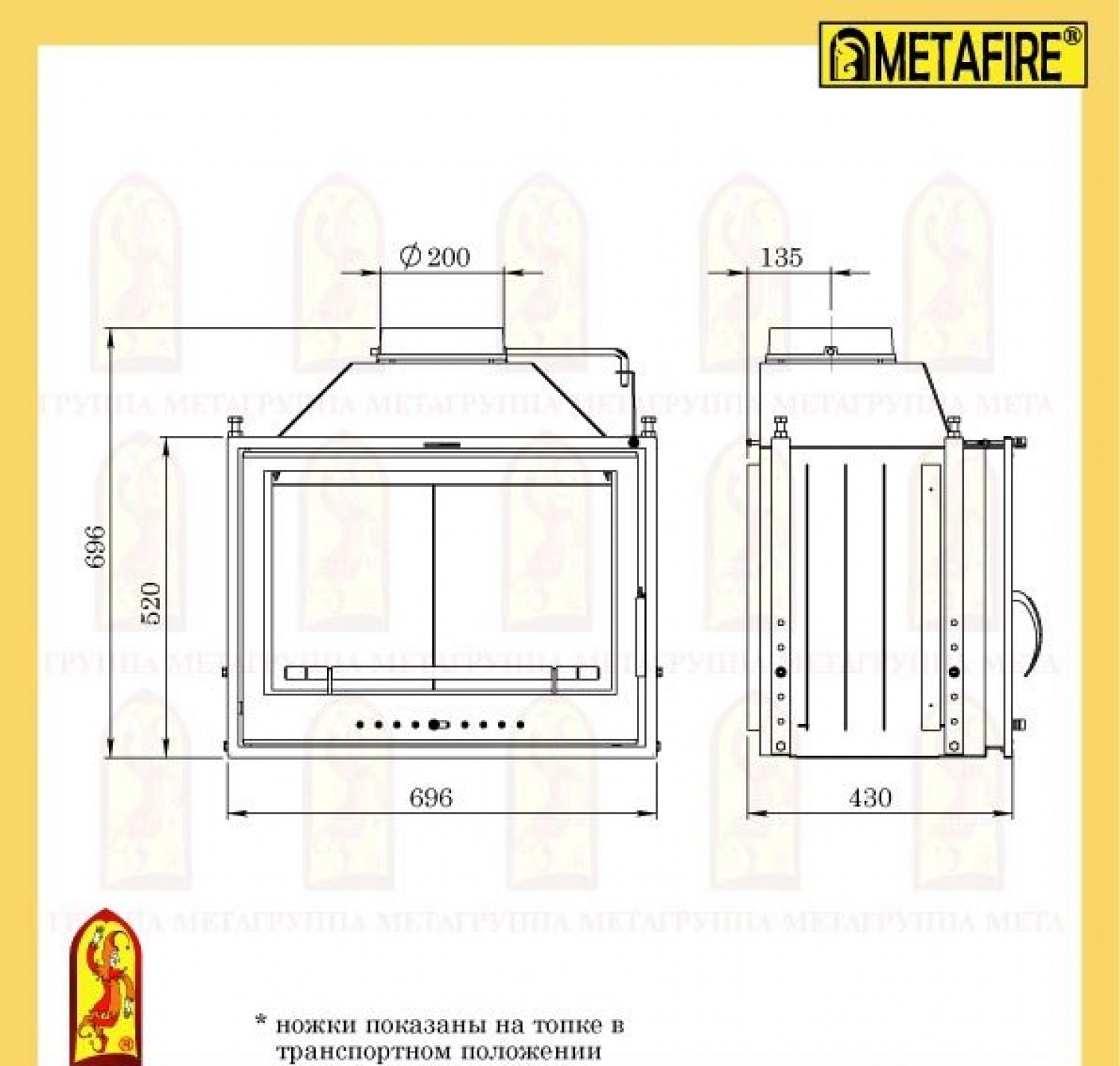 Топки MetaFire™ изготовлены из высококачественной стали. Топочная камера футерована шамотными огнеупорными плитами. Для уплотнения разъёмных элементов топки, используется термостойкий шнур. Топки укомплектованы специальными термостойкими стёклами (стеклокерамикой Neoceram N-O производства Японии). Для удобства установки все топки MetaFire™ регулируются по высоте.